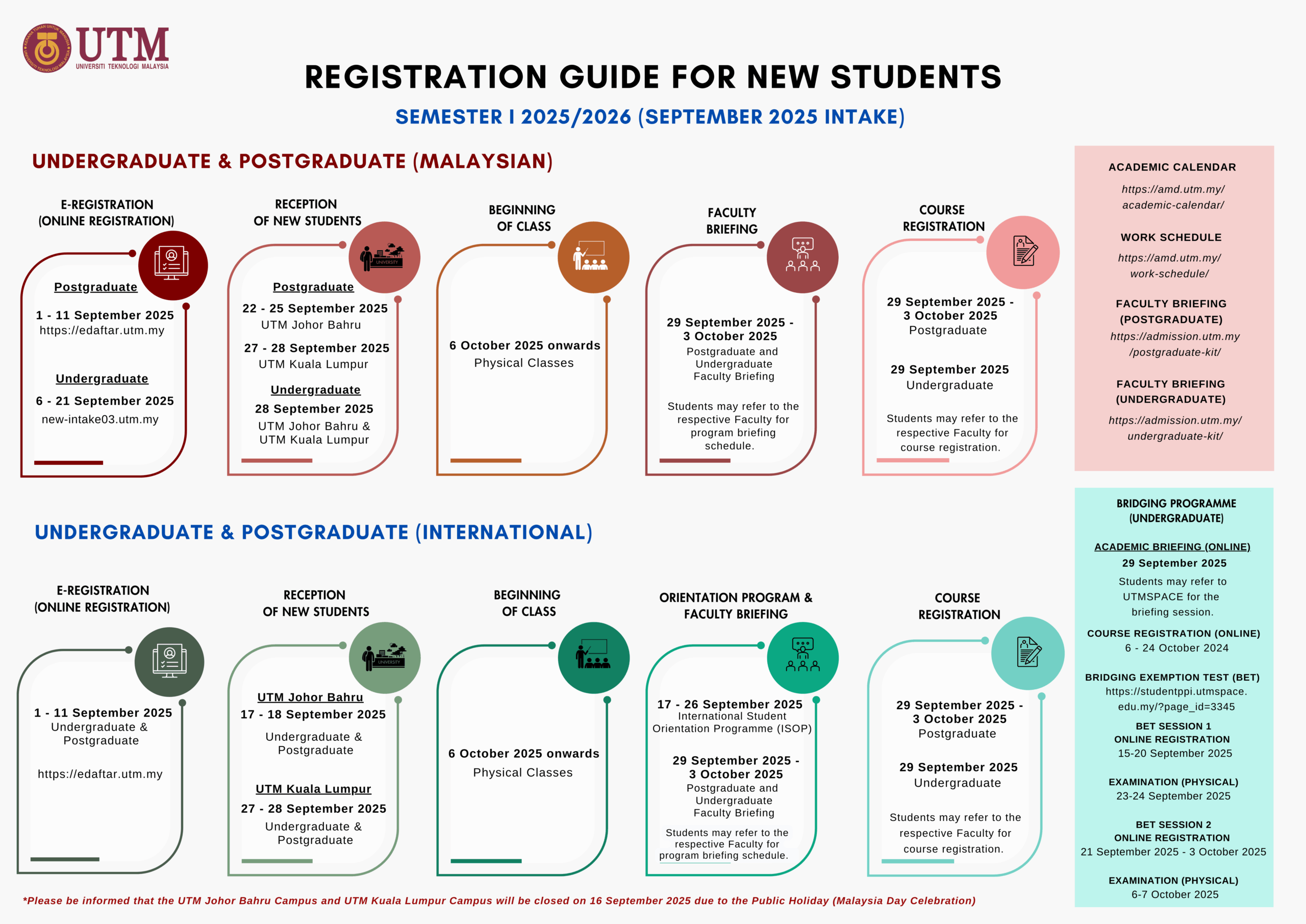 Please refer to UTM ACADEMIC CALENDAR Semester 1, 2025/2026 SESSION – https://amd.utm.my/academic-calendar/
